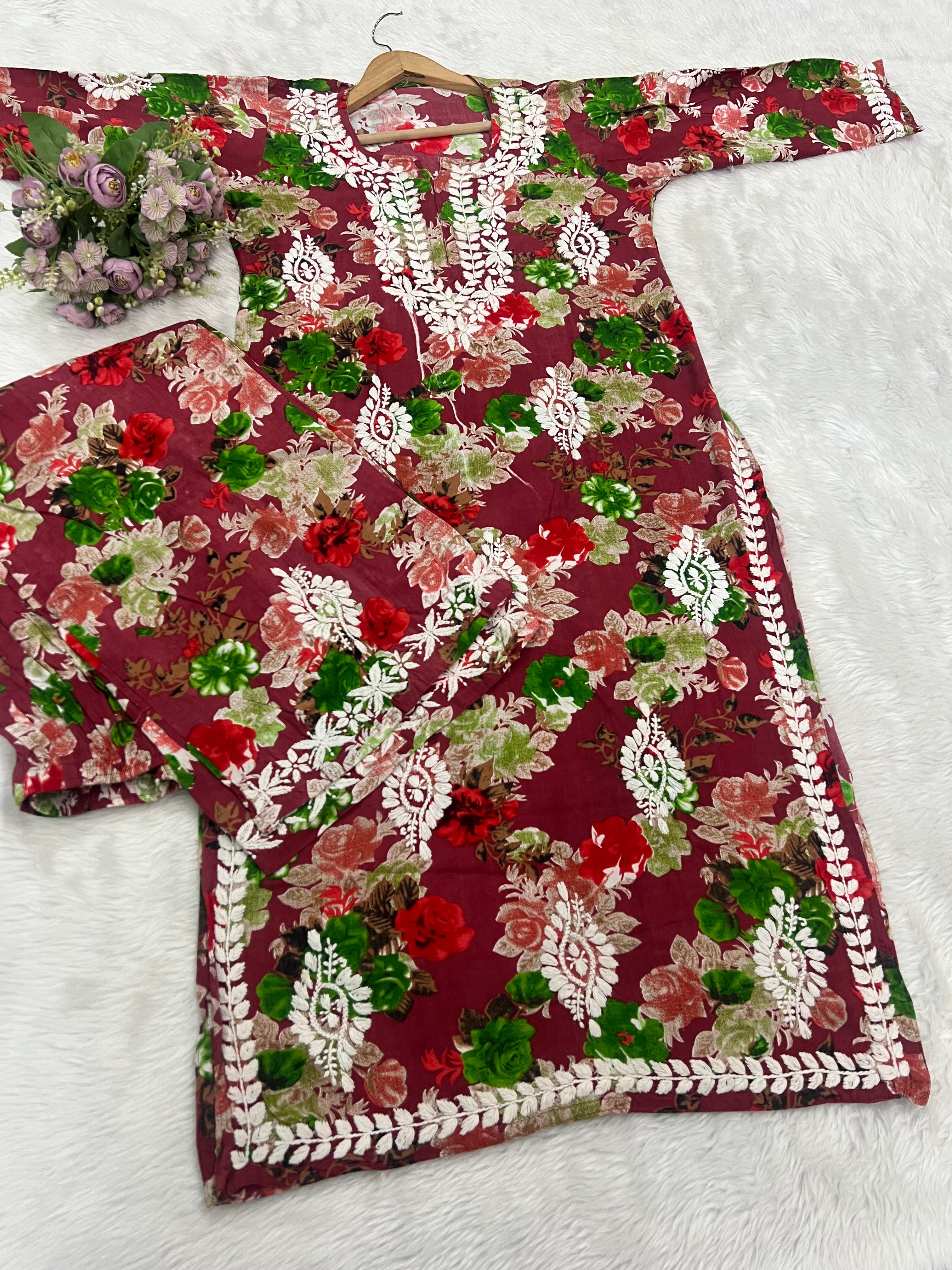 Handcrafted Elegance: Modal Chikankari Kurti & Palazzo Set