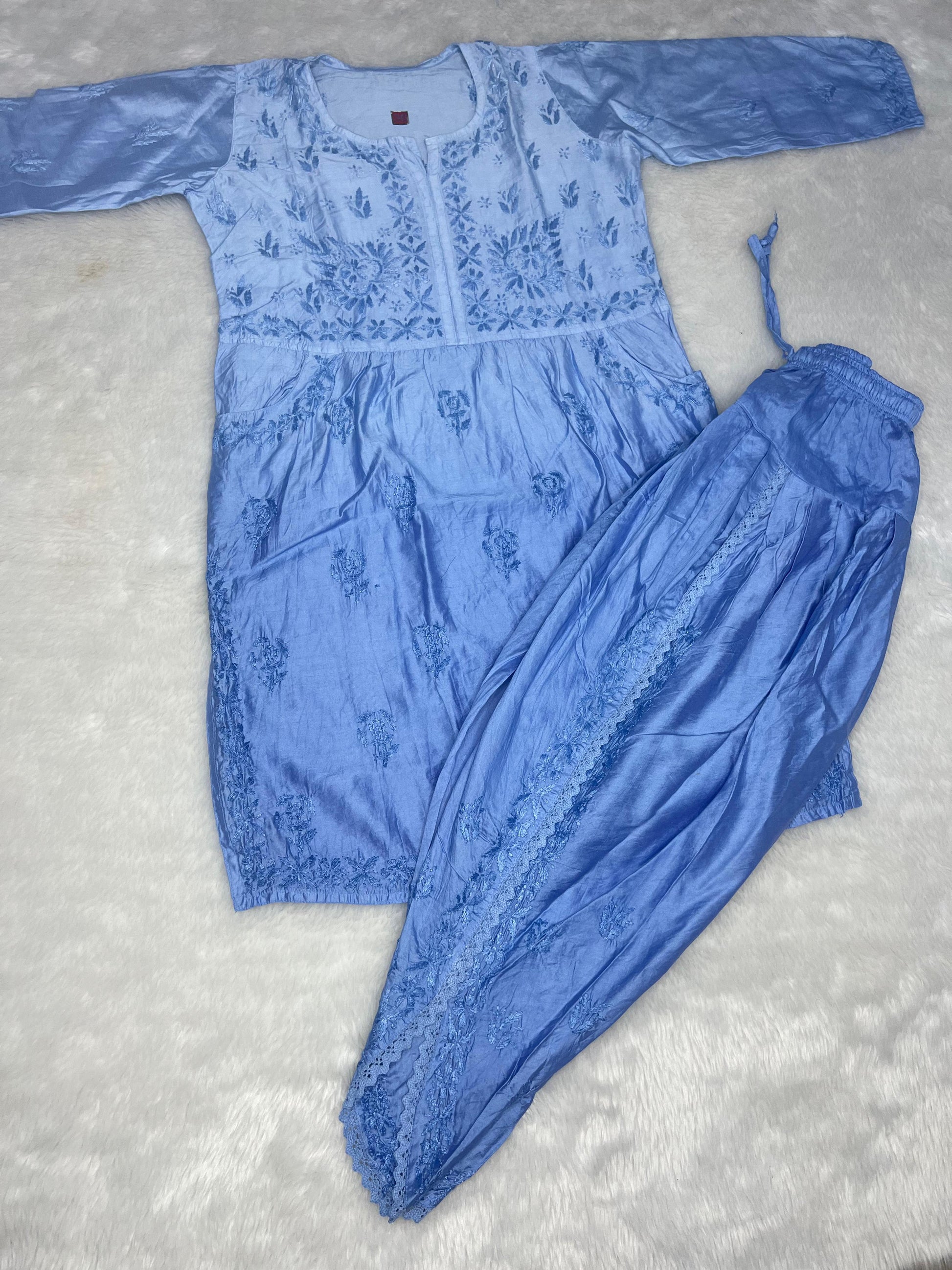 Hand wash separately with mild detergent to preserve the delicate chikankari embroidery.