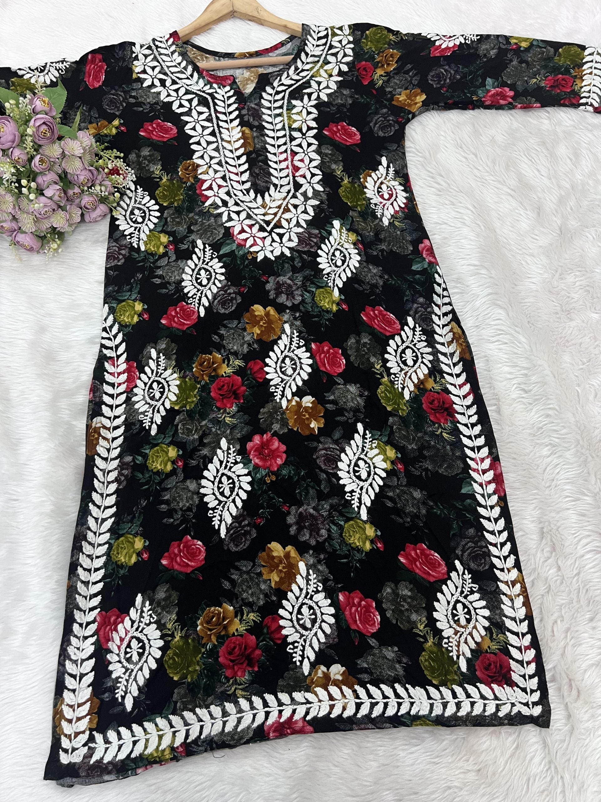 A Rayon Fabric handwork Chikankari floral print kurti sounds absolutely charming! Rayon is known for its softness and draping qualities, making it a comfortable choice for clothing. Chikankari embroidery adds a touch of elegance and intricate detail, while floral prints bring a lovely, feminine vibe to the outfit. This combination creates a beautiful fusion of traditional craftsmanship and contemporary style. It sounds like the perfect choice for a graceful and chic ensemble!