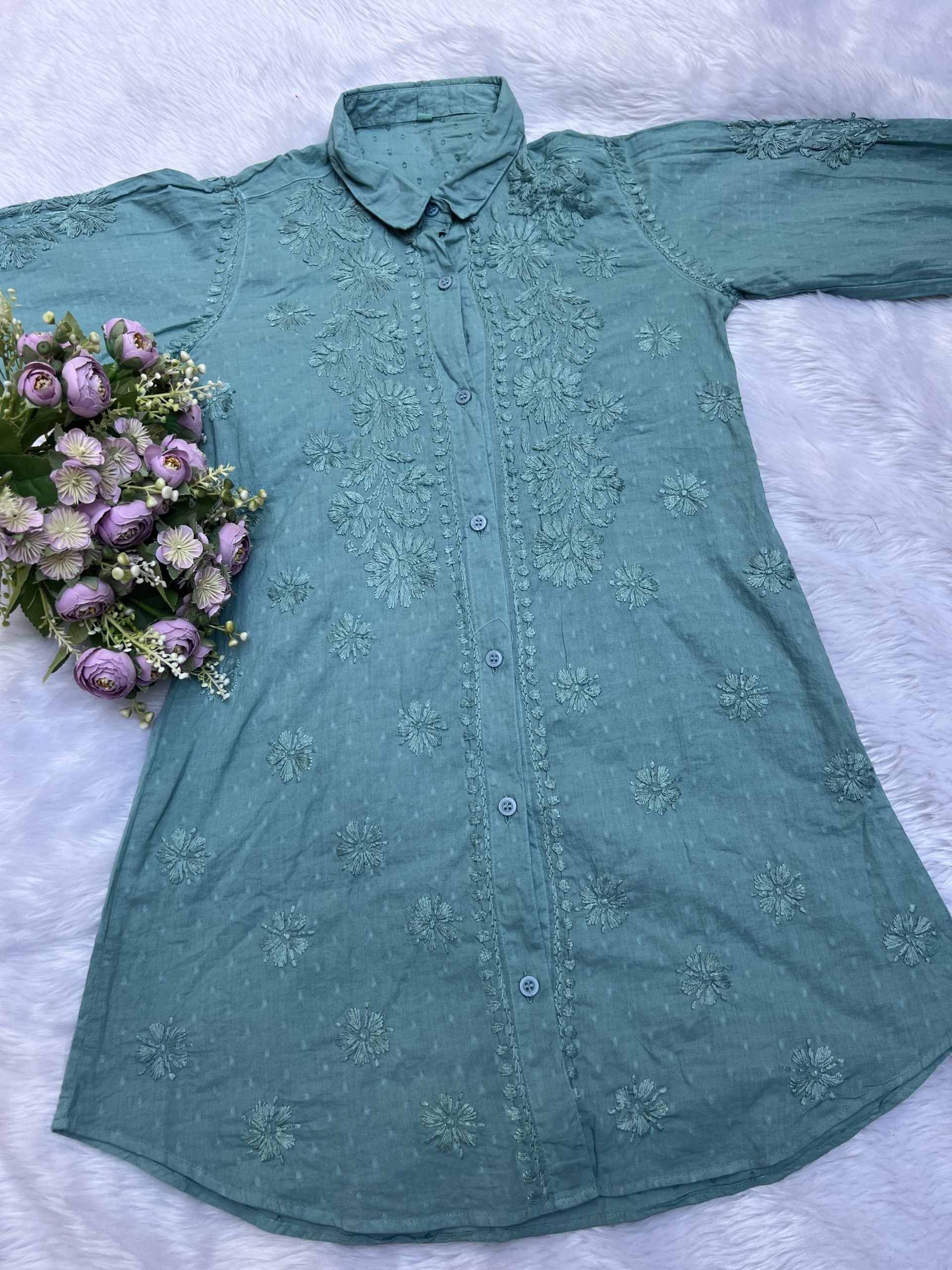Hand wash separately with mild detergent to preserve the delicate chikankari embroidery.