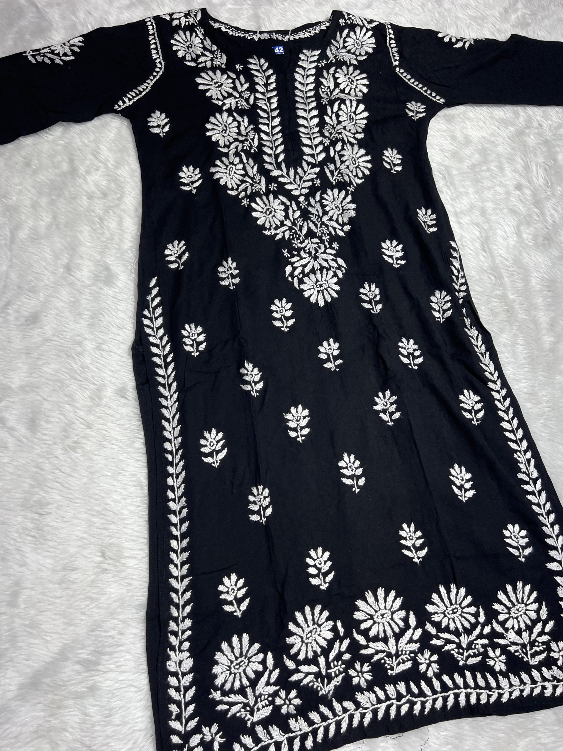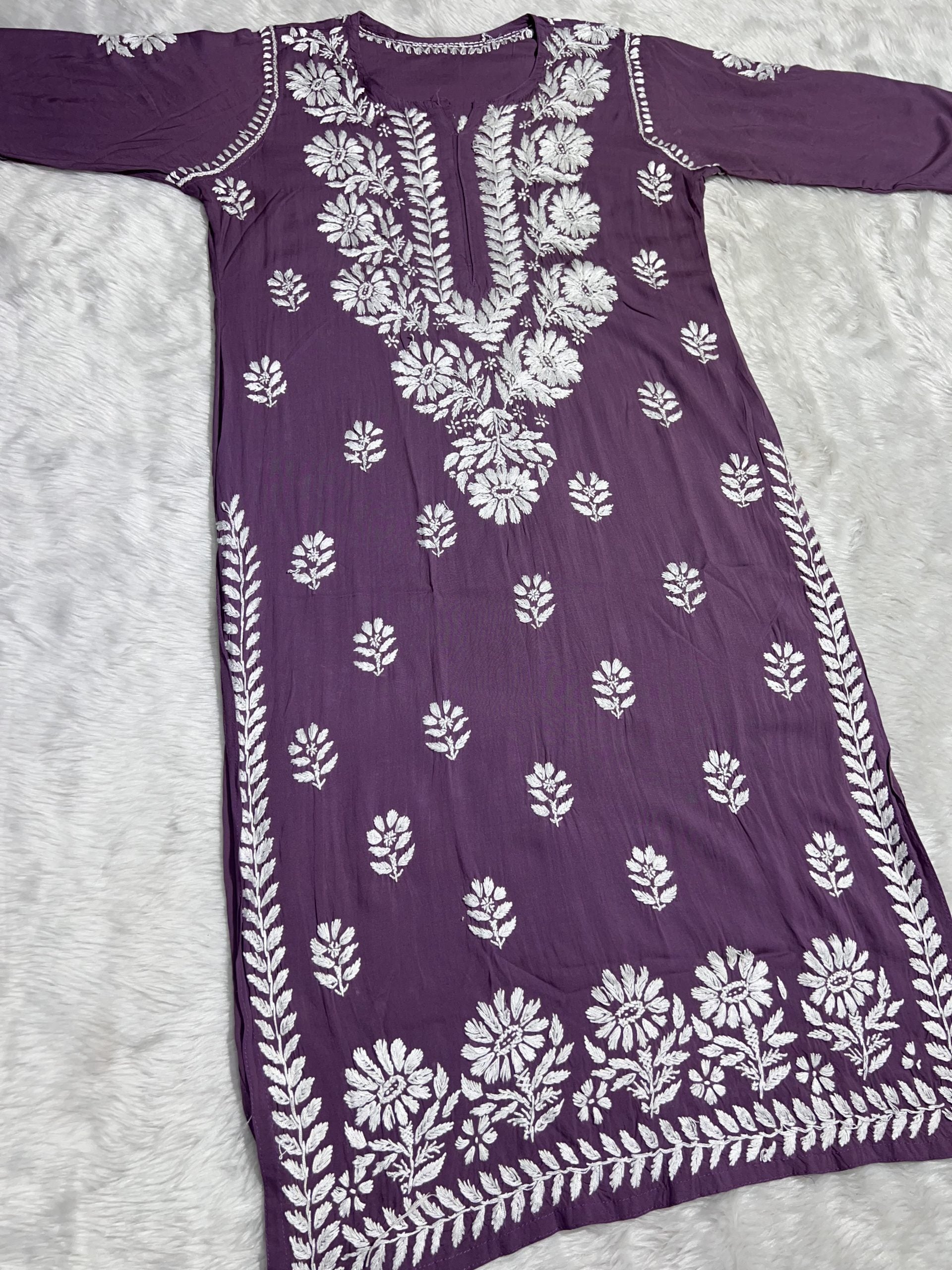 Modal fabric handwork Chikankari kurti sounds lovely! Modal fabric is known for its softness, breathability, and draping qualities, making it a comfortable choice for clothing. Chikankari is a traditional embroidery style from Lucknow, India, characterized by delicate and intricate thread work, usually done with white thread on pastel or light-colored fabrics.