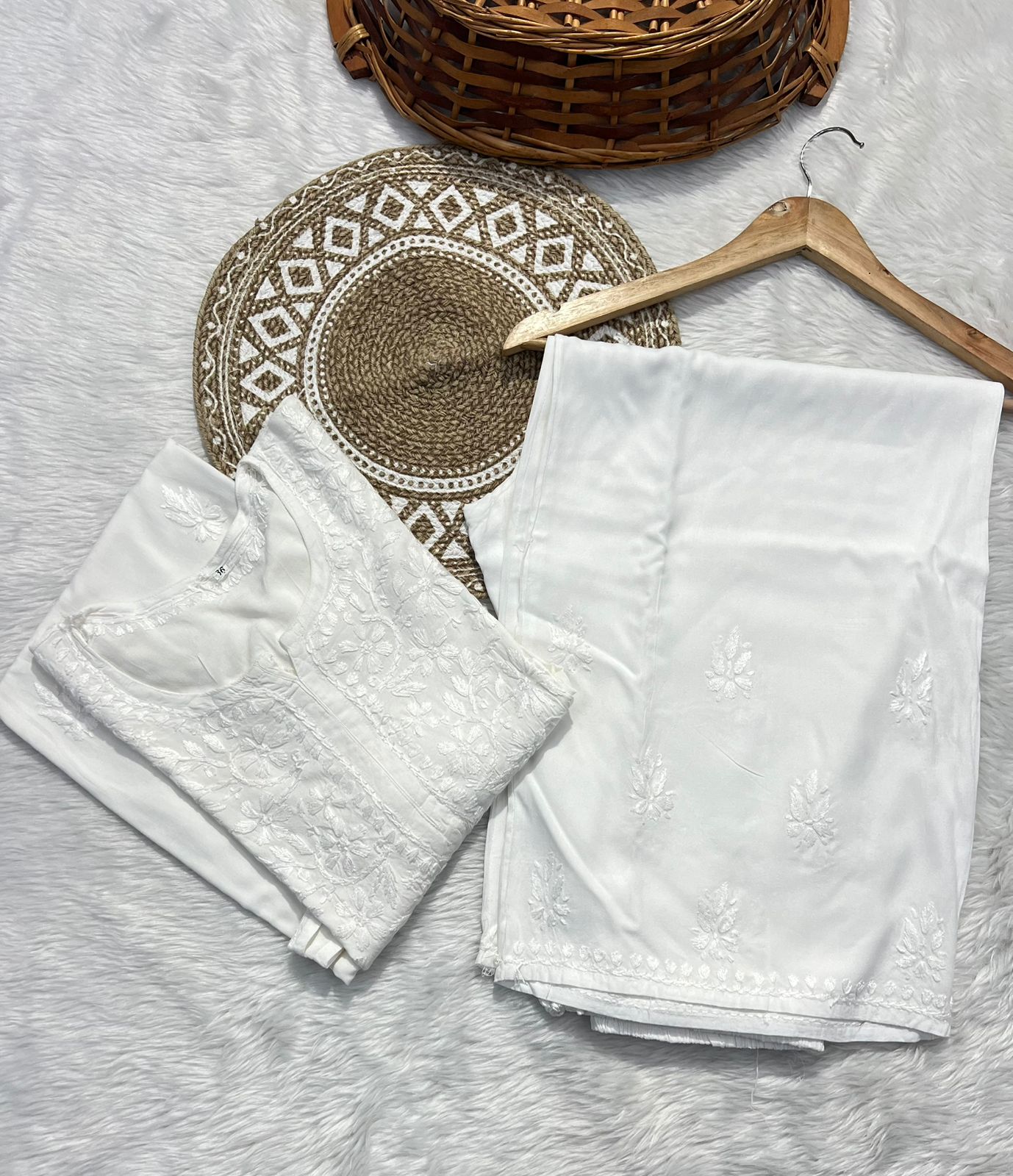 Elevate your ethnic wardrobe with this elegant white rayon chikankari kurti palazzo set, crafted with fine handwork embroidery that reflects timeless Lucknowi artistry. The soft rayon fabric ensures comfort and breathability, making it perfect for all-day wear. Paired with a matching palazzo, this set is ideal for festive occasions, family gatherings, or casual outings.