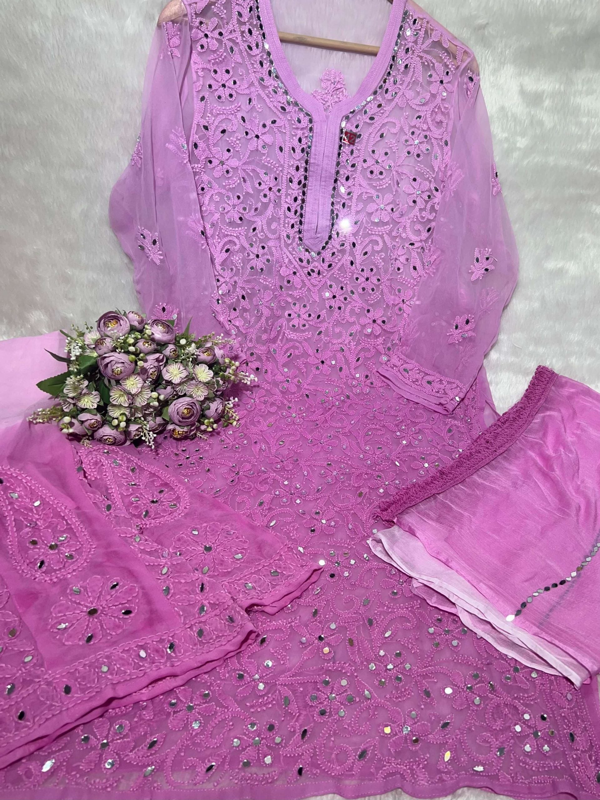 Hand wash separately with mild detergent to preserve the delicate chikankari embroidery.