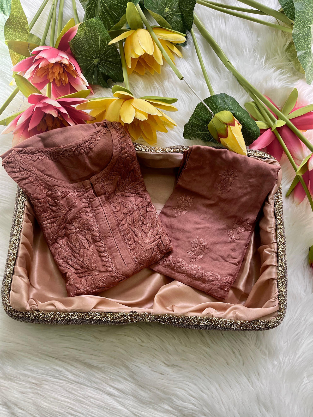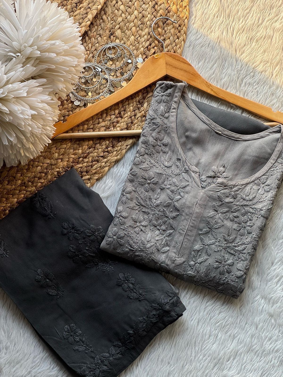 Hand wash separately with mild detergent to preserve the delicate chikankari embroidery.